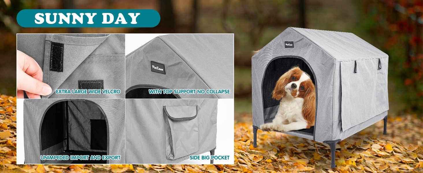 【INDOOR & OUTDOOR USE】A-frame canopy roof.There are 2 Air Vents on the pet outdoor shelter. In sunny days, curtains can be rolled up to enhance air circulation.In windy days, the curtains can be rolled down and fixed with velcros.Tips: The roof is not protected from water.In rainy days, we suggest that you move the pet bed into the house so that your furry friend won't get wet.