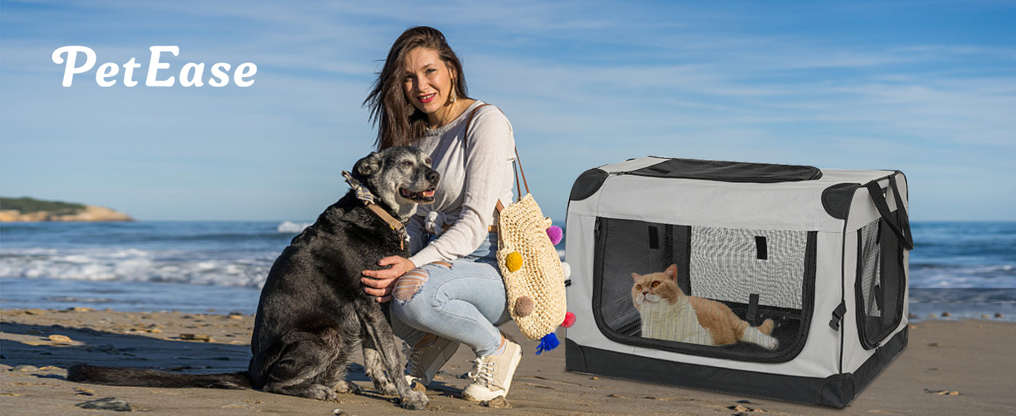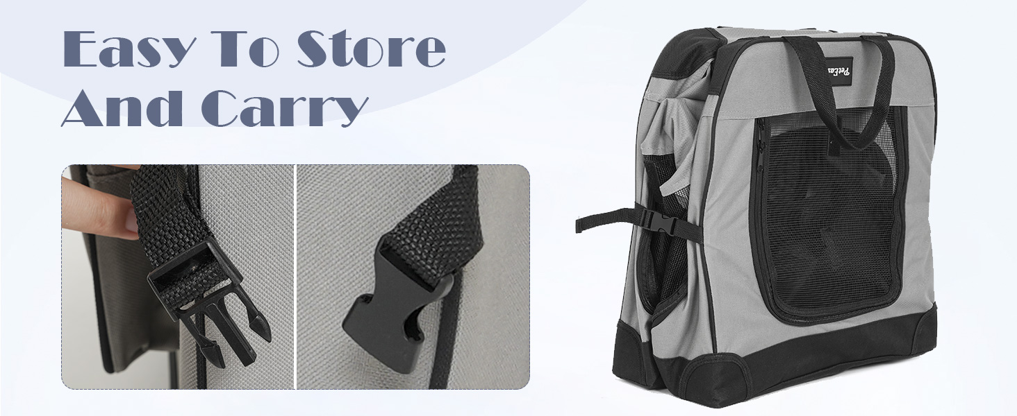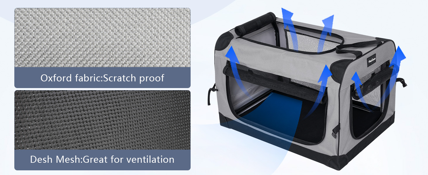 【Sturdy and Safe】PETEASE Soft Sided Pet Foldable Travel Crate features a sturdy yet lightweight steel tube design, made of 600D Oxford fabric, with a reinforced frame structure to prevent pet scratches and increase stability. The crate is equipped with self-locking zippers, preventing your pet from escaping.