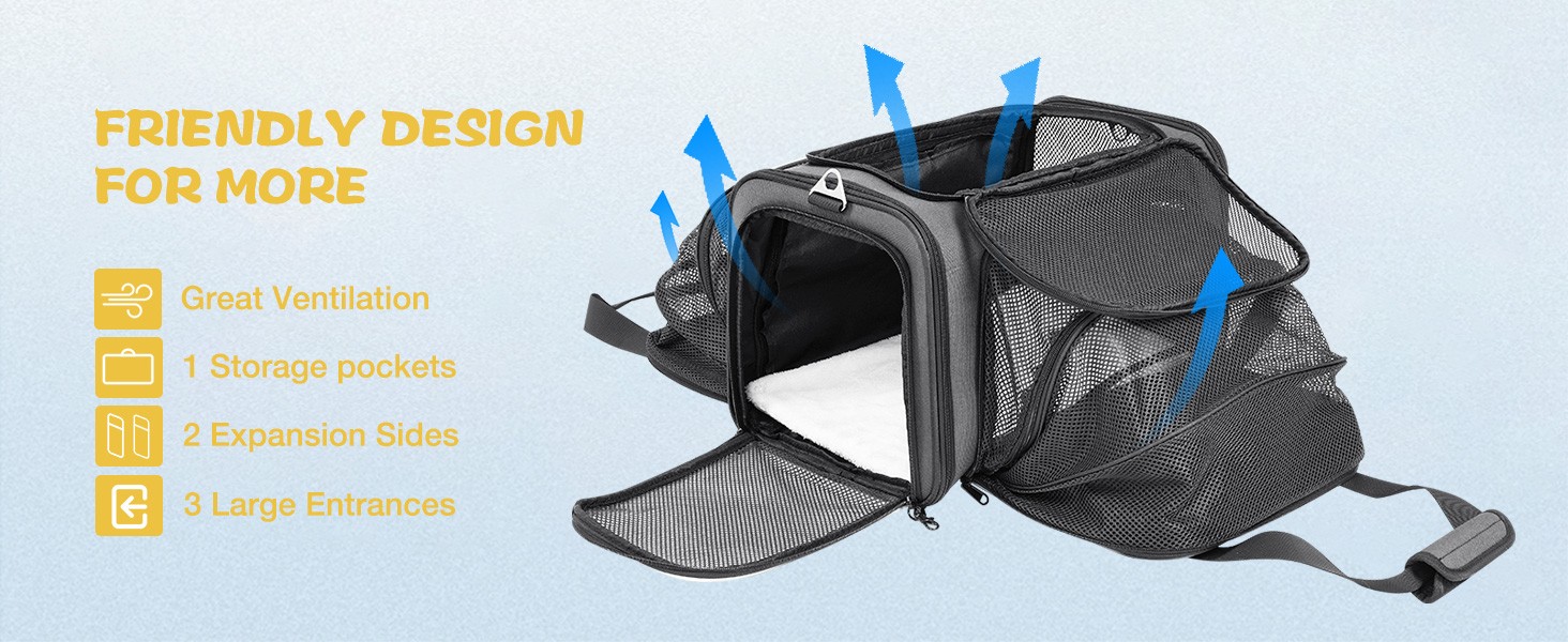Expandable and Adjustable: Customize the carrier's size based on your pet's needs. Stretch the mesh panels for more space and ventilation, or fold them up for better security and protection.