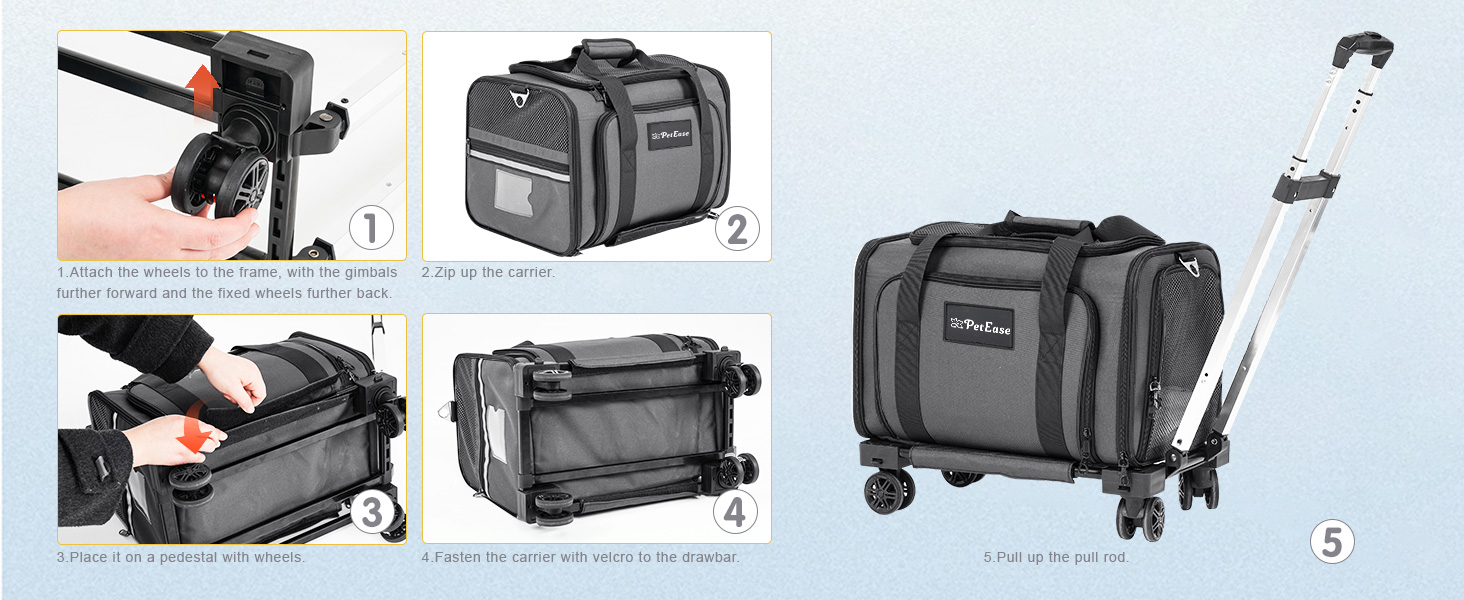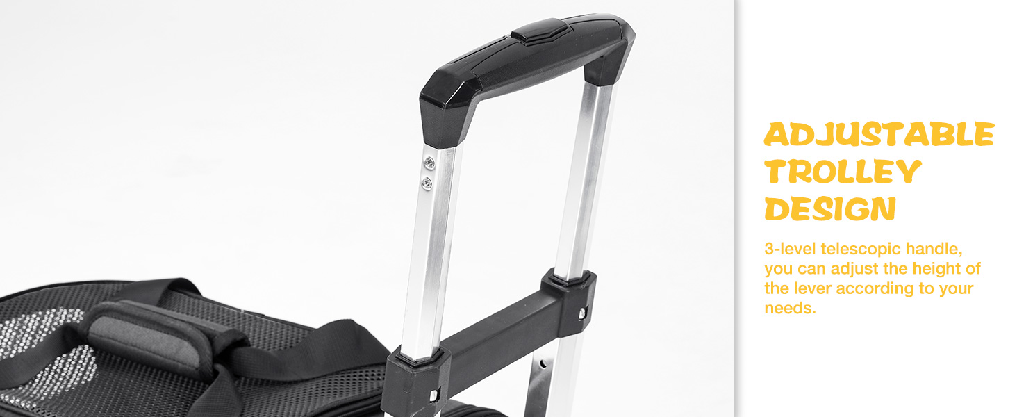 Upgraded Wheels Design:Thickened 360-degree wheels provide effortless, quiet movement on all surfaces. The brake design keeps your pet safe and secure, even on inclines.The wheeled pet carrier allows for easy maneuvering through airports, street, malls, supermarkets, etc.